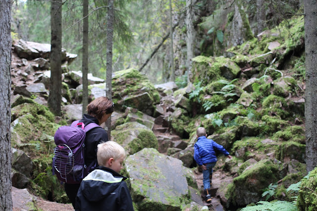 Barnen skuttade fram som små bergsgetter (medans jag hela tiden såg framför mig att de skulle snubbla, ramla och slå sönder skallen på nån av alla stenarna), och tyckte det här var den roligaste promenaden vi gått på, och förutom att den kanske var lite väl kort för att jag ska vara helt nöjd så håller jag absolut med om att det är kul att klättra fram snarare än att bara gå.